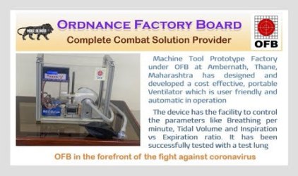 Another notable achievement was by Machine Tool Factory under OFB at Ambernath, Thane, Maharashtra, who designed and developed a cost effective, portable ventilator which is user friendly and automatic in operation. The device has the facility to control the parameters like breathing rate per minute, tidal volume and inhalation vs exhalation ratio. It has been successfully tested with a test lung. To complement this effort repair of a large number of ICU ventilators in the hospitals at Hyderabad was undertaken by the Ordnance Factory Medak.
